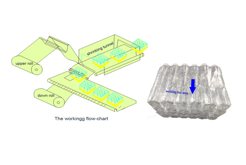 after the tin can,bottles or other container feeding into the wrapping area, upper and bottom film will be welded together,
